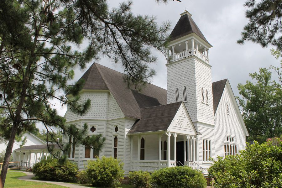 Across Carolina Avenue from Sumter Avenue between Gadsden Street and Waring Street is the Saint Paul's Episcopal Church. This structure is one of the oldest in Summerville. Constructed in 1857, St Paul's church has remained resilient through storms, the war between the states, and the earthquake of 1886. Many of the congregants of St. Paul's original congregation were from the St George's Parish at Dorchester on the Ashley River; it was destroyed by British troops in 1782. Later on this tour we'll be passing by another of Summerville's historic churches. The original Summerville Presbyterian Church was constructed in 1831. It's congregation's origins stem directly from the church at the old settlement of Dorchester on the Ashley River. Their original building was too badly damaged after the 1886 earthquake, and consequently construction of a new church building began in 1894. Their current place of worship was dedicated in 1895.